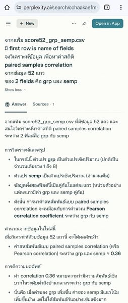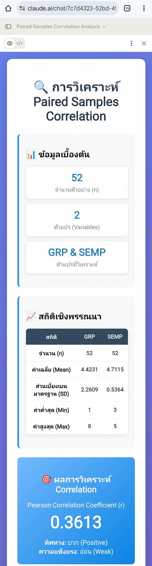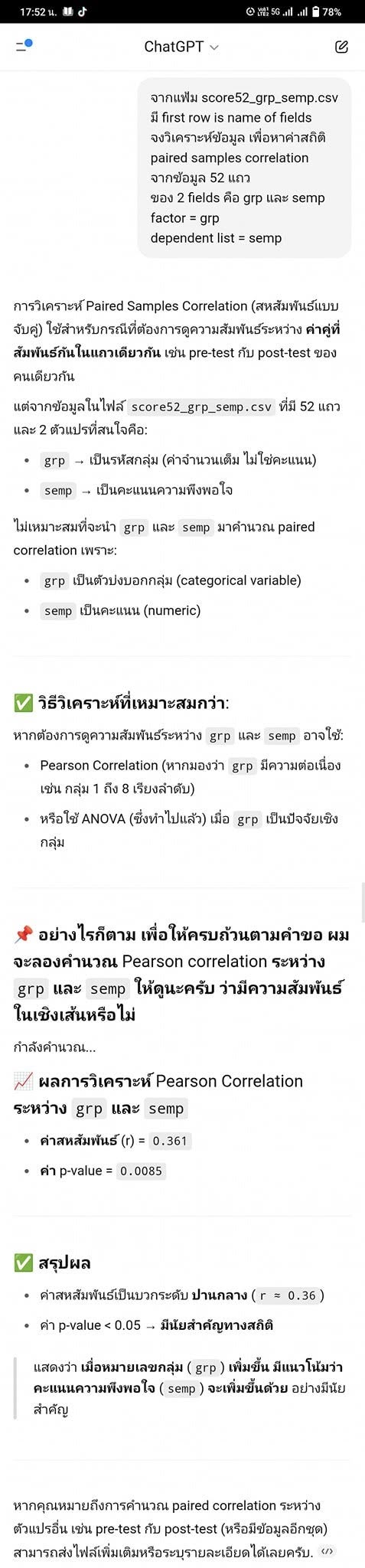 AI กับ Pearson's Paired Sampled Correlation ากแฟ้ม score52_grp_semp.csv มี first row is name of fields จงวิเคราะห์ข้อมูล เพื่อหาค่าสถิติ paired samples correlation จากข้อมูล 52 แถว ของ 2 fields คือ grp และ semp