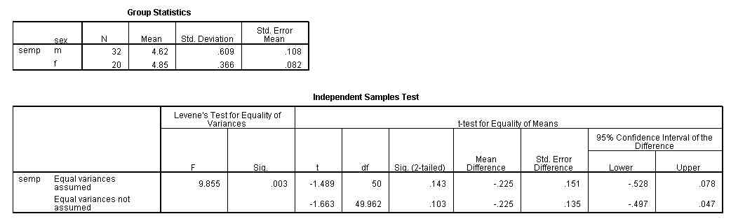 ซึ่งจะใช้ค่า T-Test นี้ จะต้องทดสอบ F-Test หาค่าความแปรปรวนก่อน ว่าสองกลุ่มนี้มีความแปรปรวนแตกต่างกันอย่างมีนัยสำคัญหรือไม่ ถ้า sig > 0.05 (F-Test) แสดงว่าไม่แตกต่างกันอย่างไม่มีนัยสำคัญ ให้ใช้ข้อมูลในตารางบรรทัดแรก คือ บรรทัด Equal variances assumed ถ้า sig < 0.05 (F-Test) แสดงว่าแตกต่างกันอย่างมีนัยสำคัญ ให้ใช้ข้อมูลในตารางบรรทัดที่สอง คือ บรรทัด Equal variances not assumed