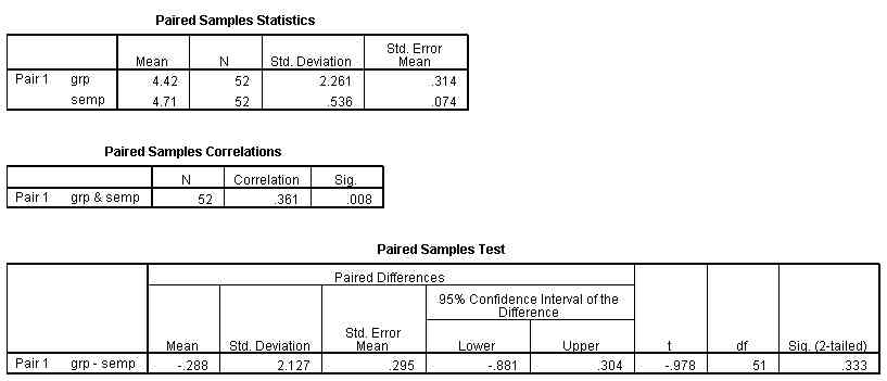 (กรณี grp กับ semp คู่นี้ ไม่ถูกต้องตามเงื่อนไขของค่าสถิติ Paired-Samples T-test)